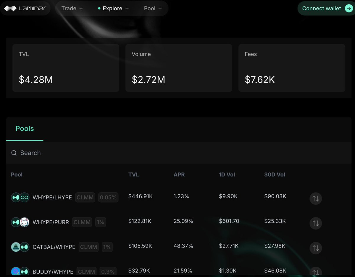AMM DEXs on HyperEVM may not leverage this advantage fully, potentially leading to capital inefficiency. To address this, projects like Laminar aim to connect AMMs to HyperCore’s orderbook infrastructure.