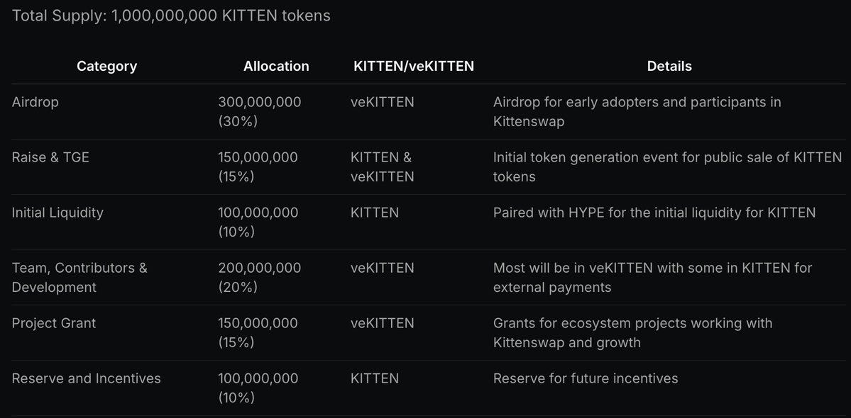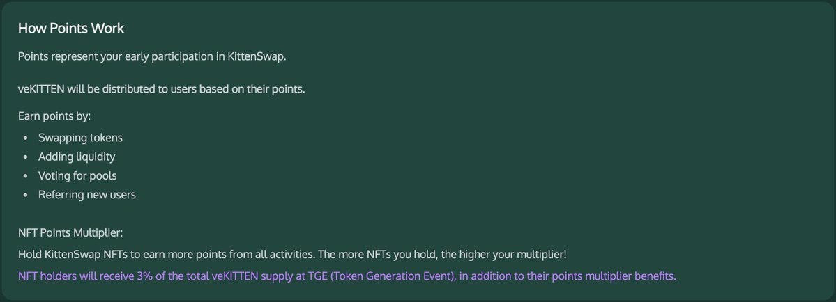 KittenSwap distributes 30% of its token supply via points to LPs, community contributors, NFT holders, and referrers. Mechacats NFT holders receive boosted rewards. Token airdrops are planned for veKITTEN holders.