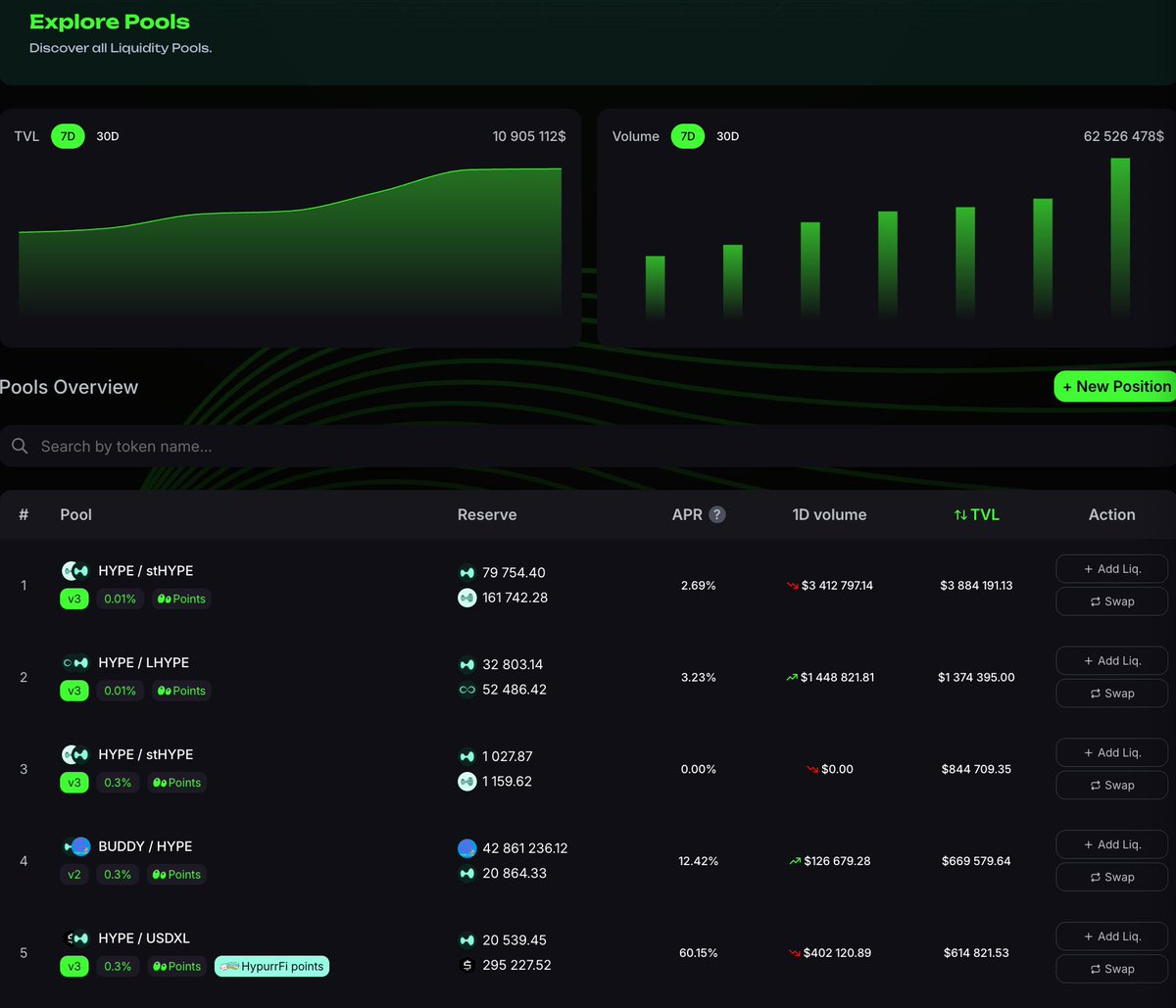While most pools currently operate at a 0.3% fee, pairs like HYPE/stHYPE that utilize a 0.01% fee dominate in terms of trading volume. This suggests a trend toward low-fee pools in the future and indicates that the v3 model is likely to become HyperSwap's core structure.