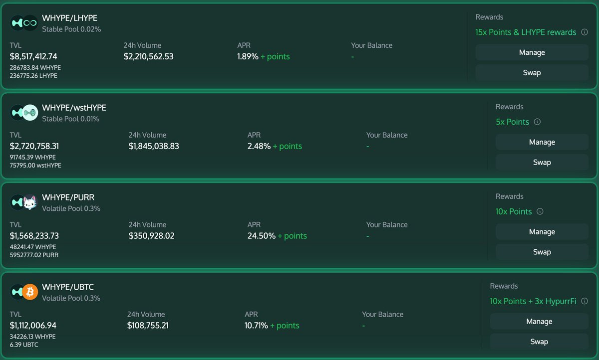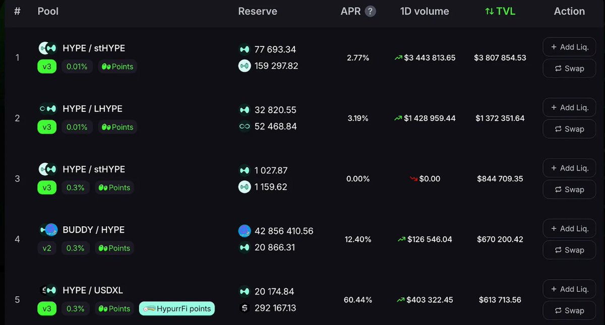 Stable pools include WHYPE/LHYPE, WHYPE/wstHYPE, KEI/USDXL, etc., with fees between 0.01%-0.02%, offering lower slippage than HyperSwap v2/v3.