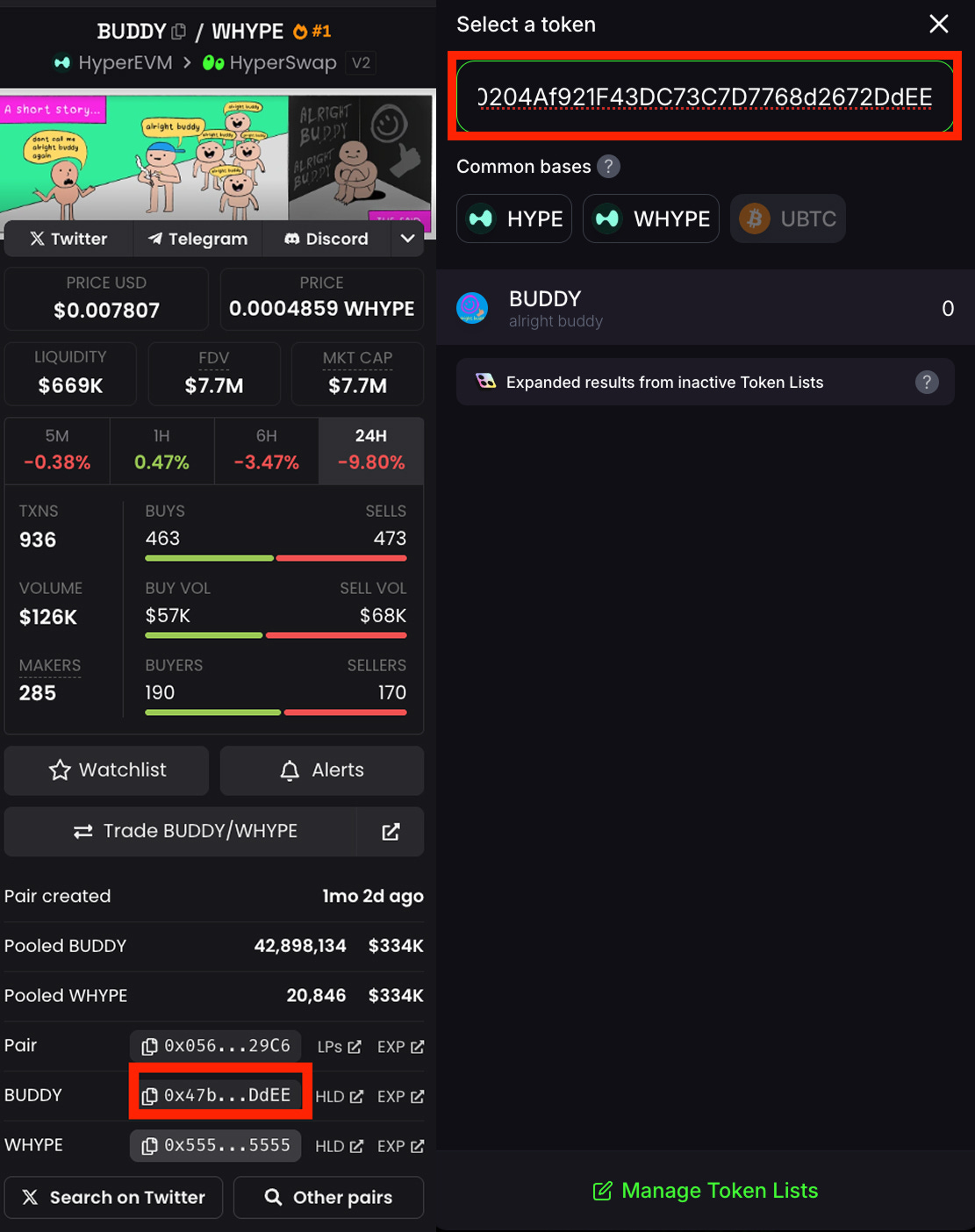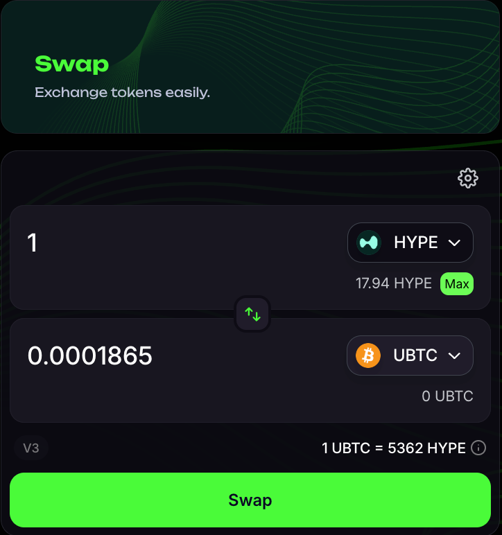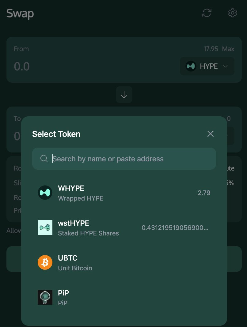 Swap UI is similar to HyperSwap, supporting token address search and direct input.