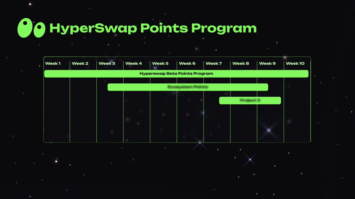 HyperSwap runs a 10-week point program distributing 10M points. Users earn points via swaps, LP, and referrals. Early adopters benefit from weighted rewards.