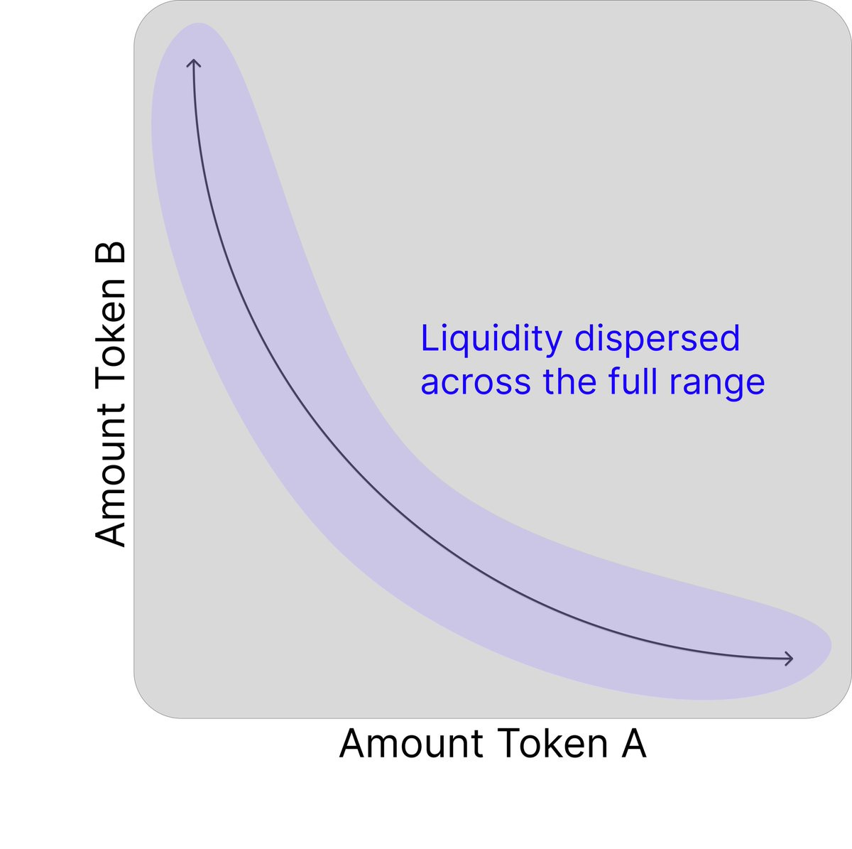 However, since liquidity is spread across the entire price curve from zero to infinity, capital efficiency is low and profitability for LPs may be limited. Large trades can cause significant slippage due to the distributed nature of liquidity.