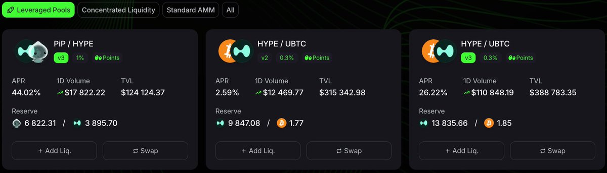 For instance, in the case of HYPE/stHYPE, the 0.01% fee pool sees concentrated volume, rendering other pools less profitable. Maximizing returns often requires depositing within narrow price ranges in low TVL/high volume/high fee pools.