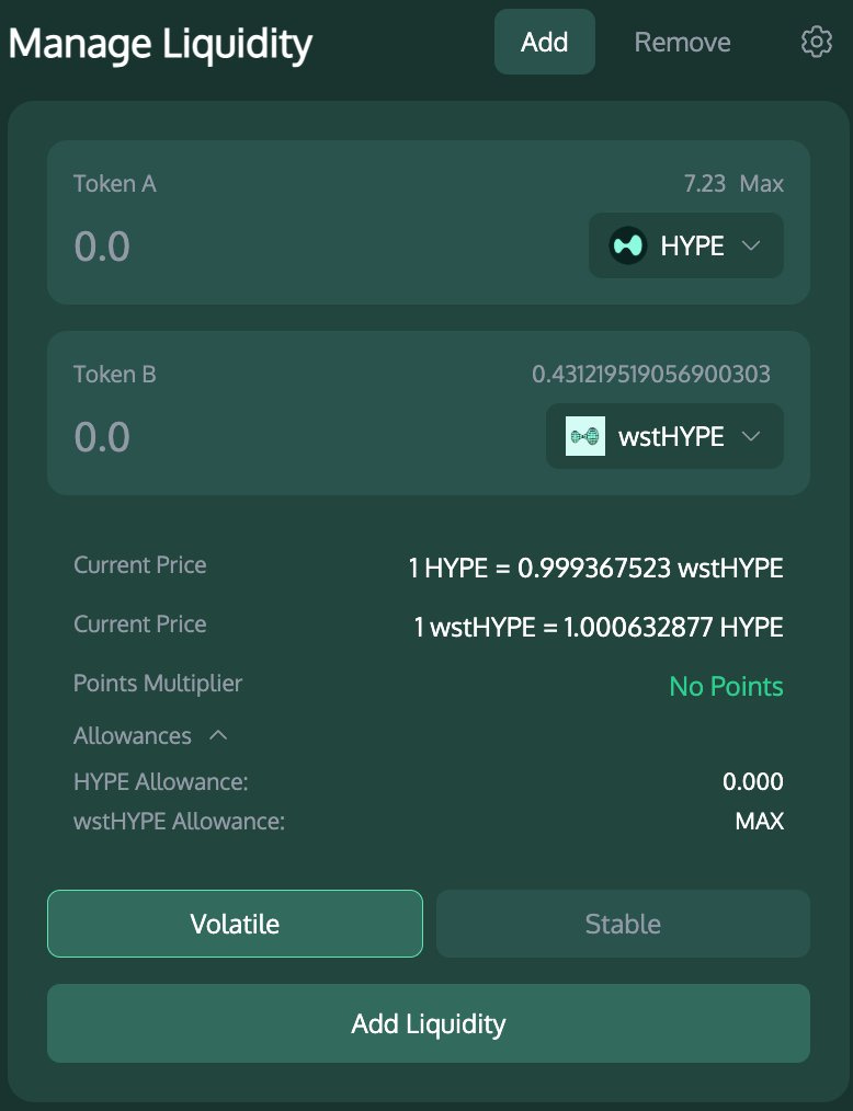 Select asset pair and choose stable or volatile pool based on value correlation. WHYPE/LHYPE and KEI/USDXL go to stable pools; PURR/HYPE to volatile pools. Following pre-existing pool strategies is advised for beginners.