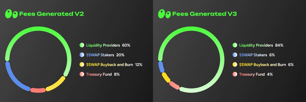 HyperSwap has yet to release detailed tokenomics. Currently, it uses $xSWAP rewards with a vesting period of 15 days to 6 months. v2 pools allocate 20% of fees to $xSWAP stakers, and v3 pools allocate 6%. Given that most volume occurs in v3, yields for $xSWAP stakers are relatively limited.