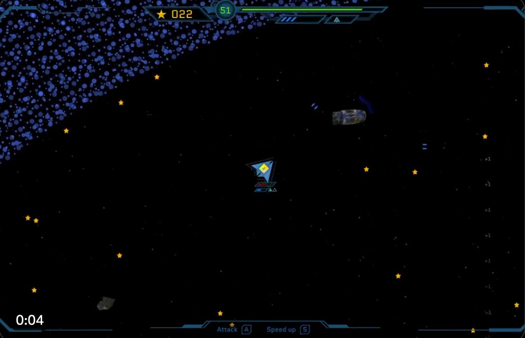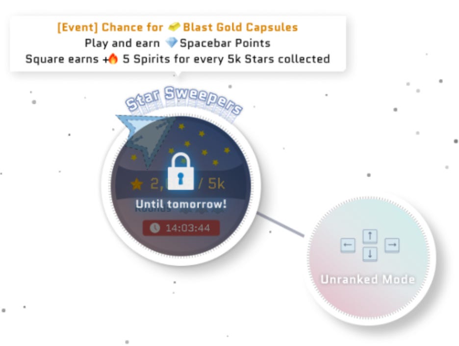 On May 30, Spacebar launched its first hyper-casual game mode called Star Sweepers. The game, reminiscent of the classic arcade game Galaga, tasks players with piloting their Protoship for one minute, dodging meteors, and collecting as many stars as possible. In this game, players can earn Blast Gold through two direct methods: