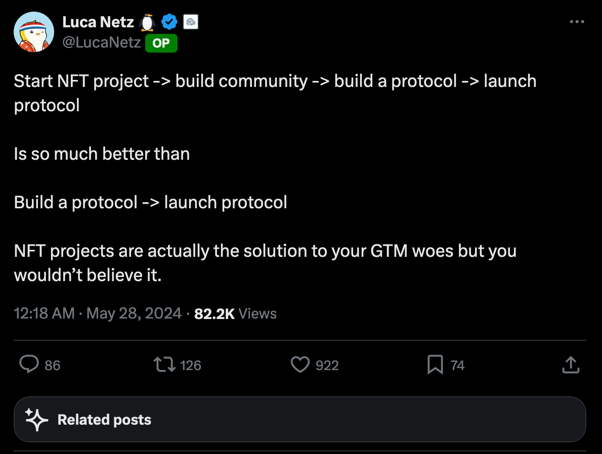 Luca Netz, CEO of Pudgy Penguins, a project making waves in the NFT scene with its impressive GTM strategy, suggests that establishing a solid community through NFTs prior to protocol launch is more effective than just building and then introducing the protocol to the world. Though the detailed plans and roadmap outlining Spacebar's long-term vision have not been disclosed, the current formation of multiple communities enjoying Spacebarโs content is a promising sign.