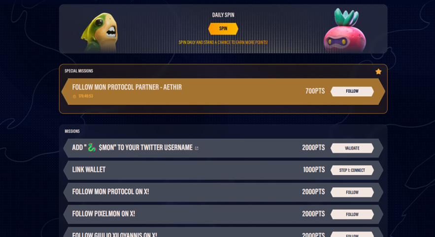 Mon Protocol, the publisher of Pixelmon, which aims to be the โWeb3 Pokรฉmon,โ launched a dedicated social farming platform to boost up their exposure on socials. Participants could earn points through designated social media quests, and the platformโs referral system encouraged more engagement. This initiative resulted an impressive number of 1.9 million account registrations, 1.3 million wallet registrations, and 300,000 daily active users. Unfortunately, during the $MON Token Generation Event, participants did not receive compensation for their social airdrop points.